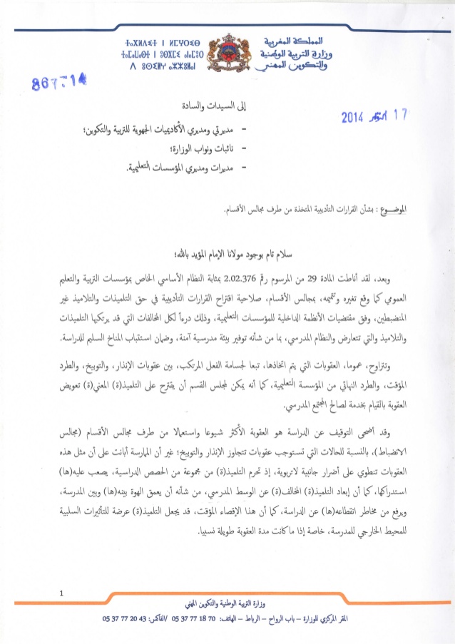 المذكرة 14/867 بتاريخ أكتوبر 2014 بشأن القرارات التأديبية المتخذة من طرف مجالس الأقسام