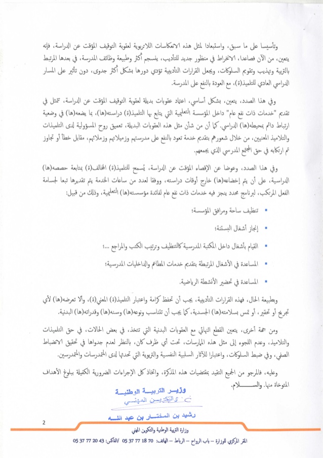 أصدر السيد وزير التربية الوطنية والتكوين المهني مذكرة بشأن القرارات التأديبية المتخذة من طرف مجالس الأقسام وخاصة منها المتعلقة بالطرد المؤقت من المؤسسة، حيث تنص المذكرة الوزارية على اعتماد عقوبات بديلة تتمثل في تقديم "خدمات ذات نفع عام" داخل المؤسسة التعليمية.