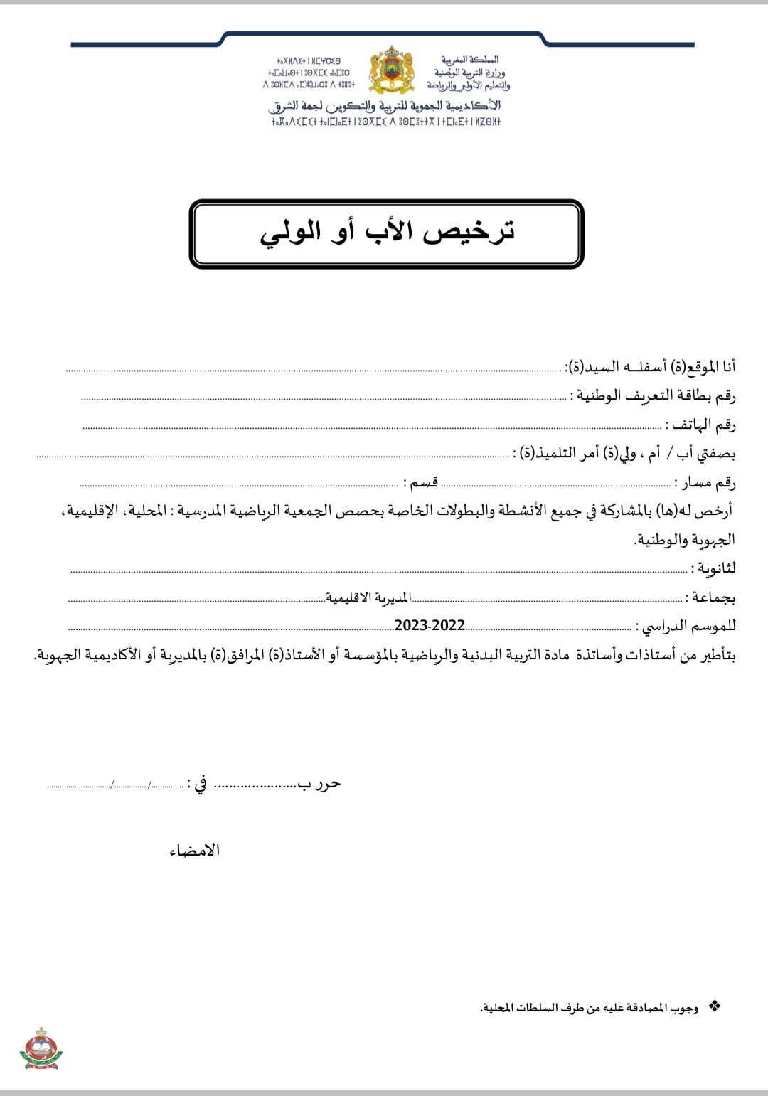 2. ترخيص الأب أو الوالي للمشاركة في الآنشطة الرياضية